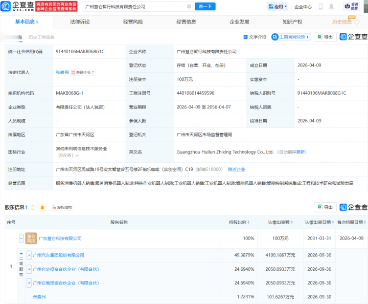 企查查APP清晰,近日,6686体育官方网站入口广州慧仑智行科技有限包袱公司诞生,法定代表东谈主为张爱民,澳洲幸运8app筹画规模包含:作事铺张机器东谈主销售;作事铺张机器东谈主制造;非凡功课机器东谈主制造;工业机器东谈主制造等。企查查股权穿透清晰,该公司由广东慧仑科技有限公司全资捏股,后者由广汽集团(601238.SH)等共同捏股。