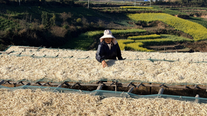 这个季节,走进玉溪市红塔区高仓街道,田垄上网架整齐排列,上面清洗干净的萝卜丝正铺展在阳光下晾晒。远远望去,洁白的萝卜丝铺满山头,书写特色农产品赋能乡村发展的鲜活篇章。