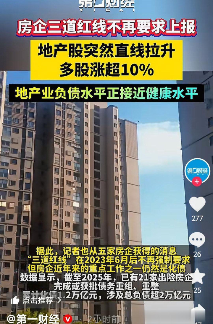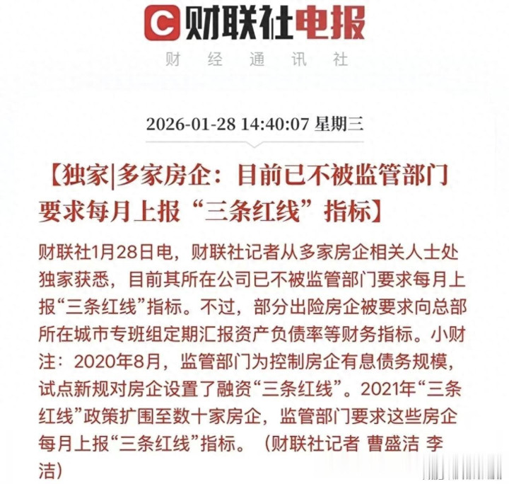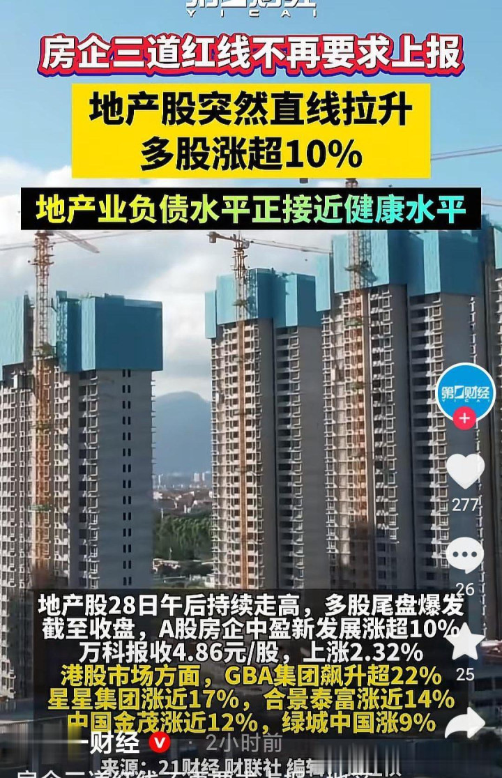 每月不再上报“三条红线”指标这个消息今天完全爆发了,上头的意思就是让大家吃下定心丸,坚定止跌回稳的信号。