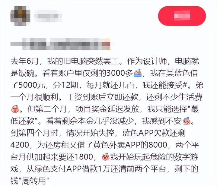 最开始每月分期还,自己挣的钱还能还上,后面她发现自己每月赚8000,其中有7000多都要用于还网贷,这才意识到自己玩儿脱了,甚至开始“以贷养贷”。