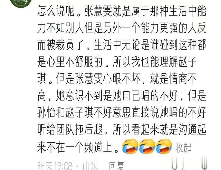 张慧雯还主动站出来诠释了一下,说那时的“嬉皮笑貌”,是因为她误以为被淘汰的是我方,想要笑一笑,抚慰孙怡。