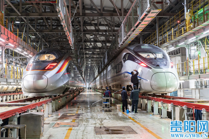 贵阳网·贵阳新闻讯 2月2日凌晨3时,位于贵阳市白云区黑石头村的贵州铁路唯一动车检修基地——贵阳车辆段贵阳北动车所内灯火通明,动车组机械师坚守岗位,对春运首日即将开行的动车组列车开展精检细修。