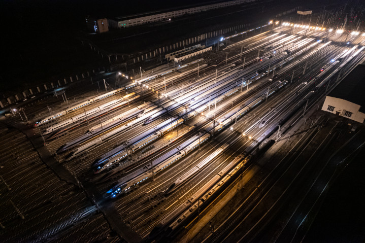 动车所外存车场上,“和谐号”“复兴号”等一列列动车组整齐列队、蓄势待发,宛如蛰伏的“钢铁巨龙”。从高空俯瞰,这片整装待发的“陆地航母”气势恢宏,即将鸣笛起航,拉开2026年春运大幕。