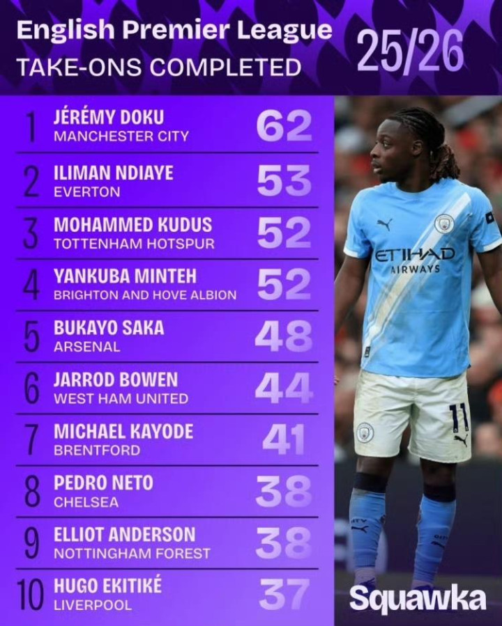埃弗顿的恩迪亚耶(53次)和热刺的库杜斯(52次)分列二三位 。恩迪亚耶的崛起极具故事性,这位埃弗顿10号不仅以53次见效过东谈主评释注解了我方的开脱才能,更因为其全面的属性堕入了转会传说。据报谈,曼联正在密切爱护这名身价百倍的“过东谈主王”,诚然他并非传统边锋,但其内切和阴私才能让权门垂涎 。