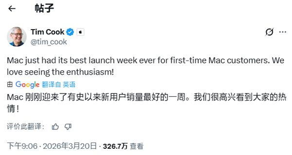 快科技3月21日音问,苹果CEO蒂姆・库克厚爱告示,新款Mac系列迎来史上针对初次购机用户的最好首周销售发扬,创下Mac上市首周新用户记载。