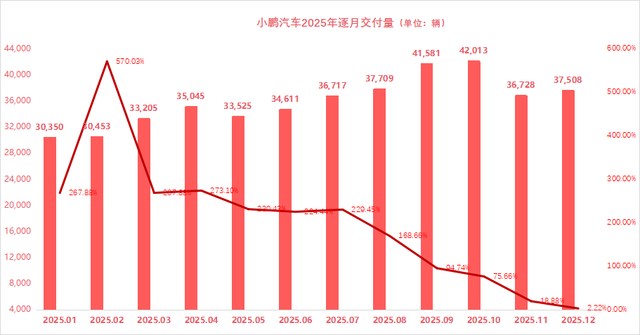 2025年小鹏汽车全年车辆请托429,445辆,较2024年的190,068辆同比增长125.9%。尽管前三季度呈逐季高潮趋势,但在四季度增速却大幅放缓。至12月,同比增幅仅2.2%。外洋商场,全年外洋销量接近翻倍至4.5万辆,外洋收入占比进步15%。