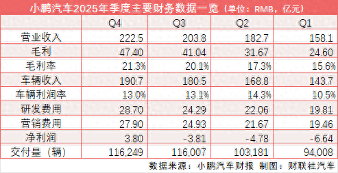 毛利率握续改善径直带动净利润好转,2025年公司全年净亏空收窄至11.4亿元,较2024年57.9亿元的净亏空收窄80.3%。2025年第四季度公司实现净利润3.8亿元,为小鹏汽车自栽培以来初度实现单季度盈利。