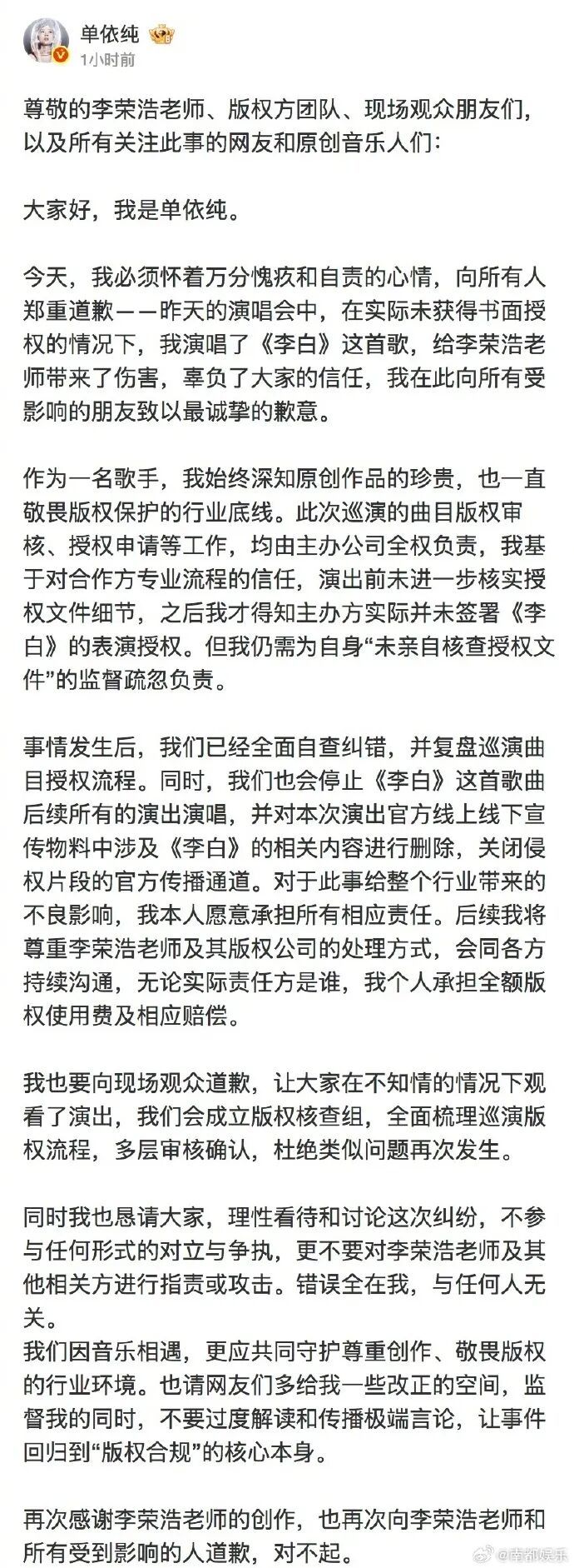 当天(3月30日)凌晨1时许,单依纯发长文报恩巡演演唱《李白》侵权一事。