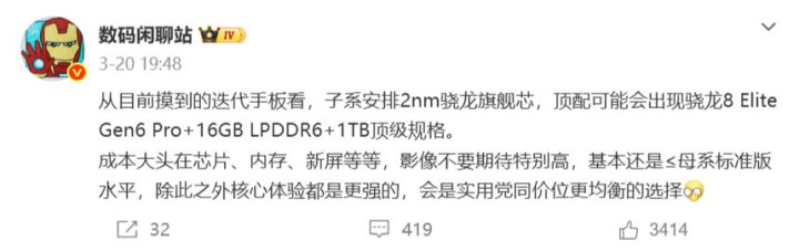 搭载骁龙8Elite Gen 6 pro措置器,诚然明确不会有散热电扇,但加执风驰游戏内核等,性能上会作念到现代顶级水准,配备9000mAh电板,接济100w有线充电+无线充电。