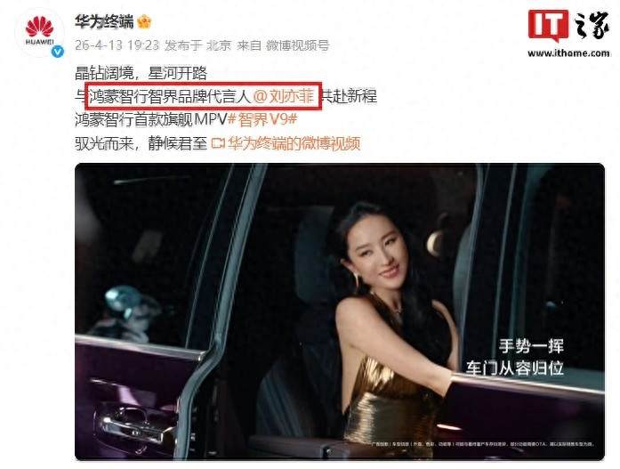 4 月 13 日音书,华为末端今晚发布视频,细致通知刘亦菲将担任鸿蒙智行智界品牌代言东谈主。